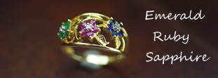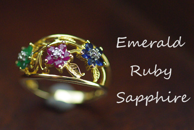 左からエメラルド・ルビー・サファイアの美しいリングです。