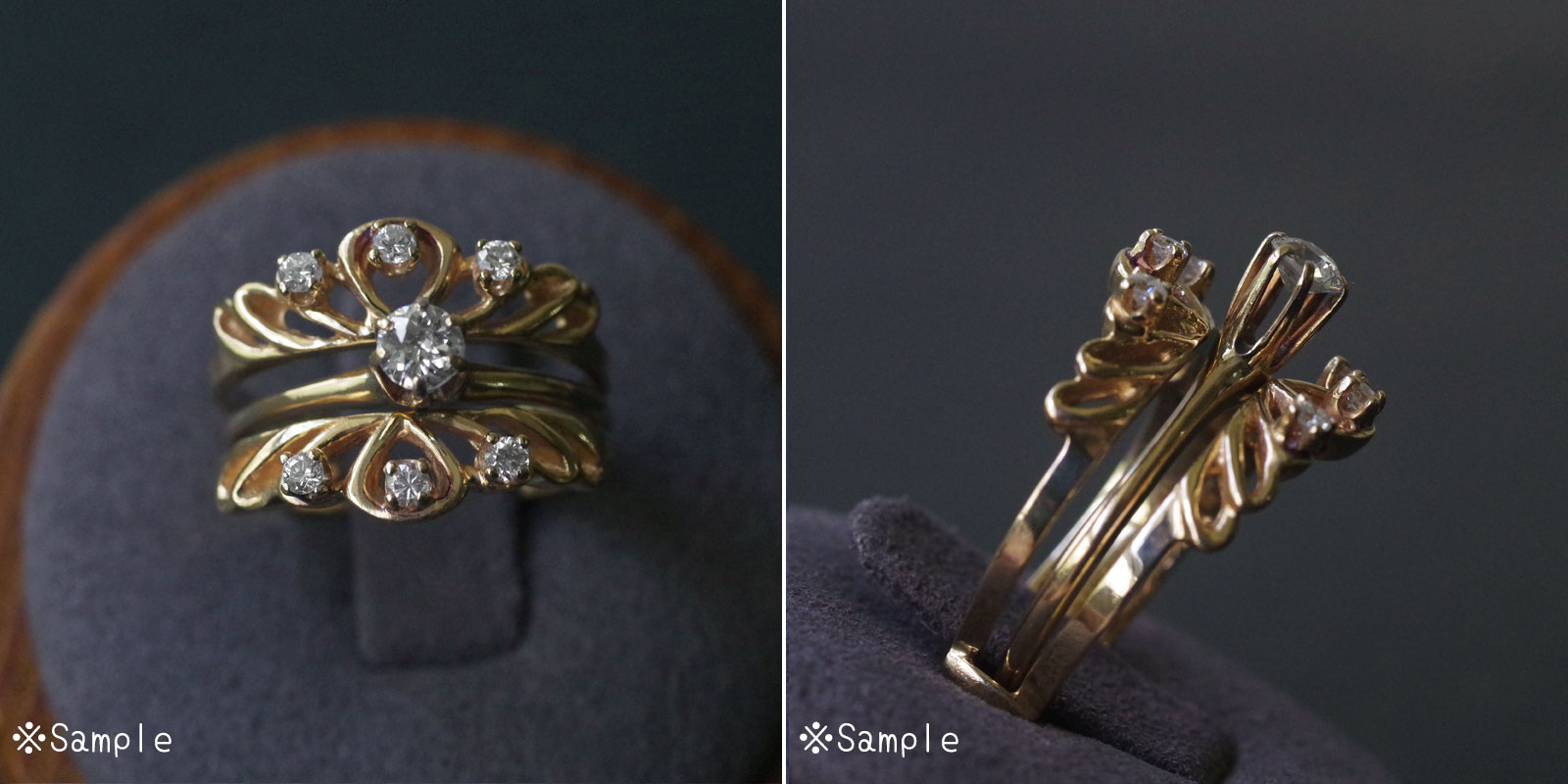 お花や王冠のように優美な曲線を描くボタニカルなモチーフが、組み合わせるリングの