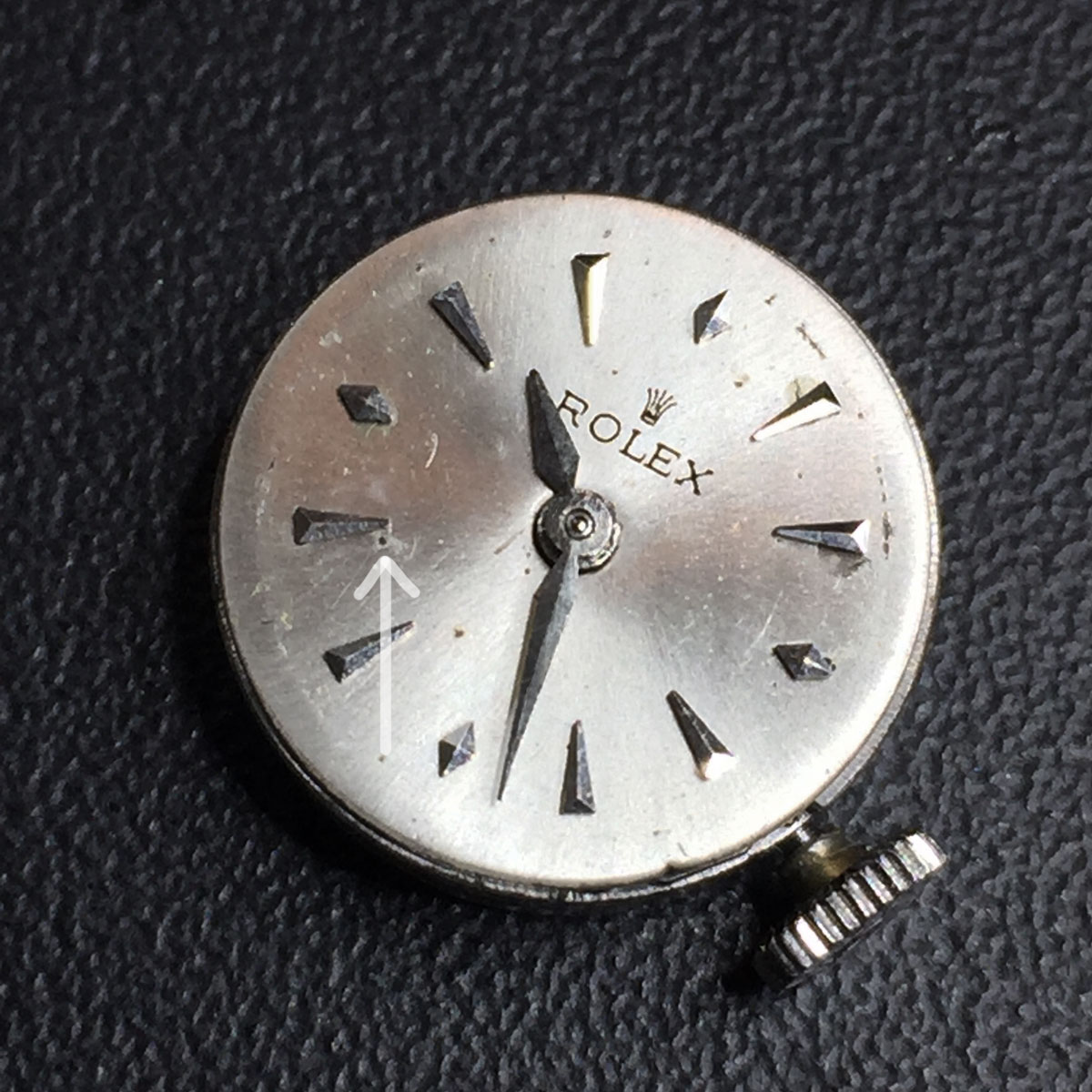 矢印の穴はアワーマーカーの裏側が破損すると出来る穴で、そちらも修復済みです。